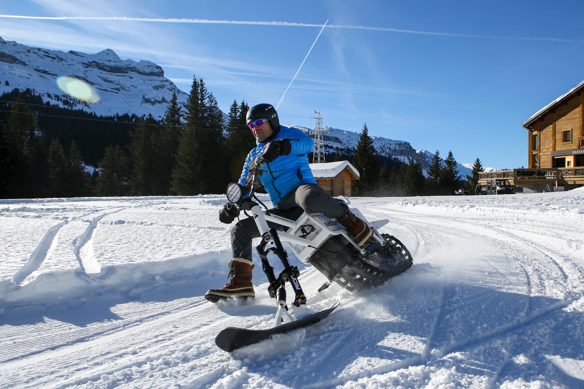 Vertrek met de sneeuwscooter vanaf het plateau bij het begin van de skilift Chapelle, tegenover de parkeerplaats buiten.